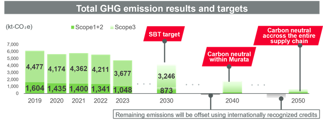 Murata Manufacturing Co., Ltd. (hereinafter, “Murata”) has decided to move its target date for achieving 100% renewable energy sourcing forward by 15 years (FY2035) and targets achieving carbon neutrality by FY2040 for the greenhouse gas (hereinafter “GHG”) emissions within Murata, and carbon neutrality by FY 2050 across the entire supply chain, given the urgent need of climate change countermeasure in the society. Murata thus accelerates its climate change countermeasures and contributes to the realization of a sustainable society.