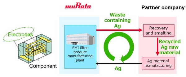 Murata Manufacturing Co., Ltd. (hereinafter, “Murata Manufacturing”) has become the first company in the electronic component manufacturing industry* to successfully create a closed-loop recycling system (hereinafter, “recycling system”) for the silver (hereinafter, “Ag”) used as a key material in Murata Manufacturing’s EMI (electromagnetic interference) filter products.