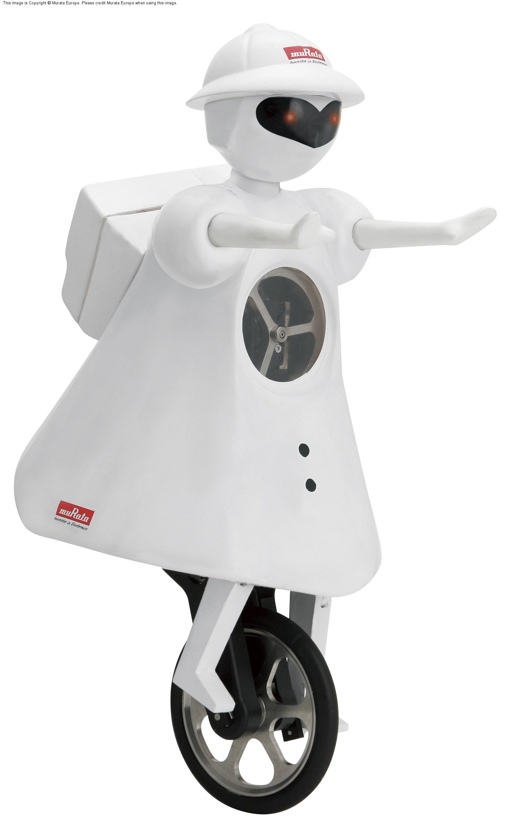 MURATA GIRL is a unicycle specialist whose ultrasound sensors enable her to keep a fixed distance away moving objects. She has a gyro sensor and a flywheel in her chest which help her to keep her balance. She can ride forwards and backwards as she has ultrasound sensors in the front of her body. She is very shy and has been known to blush!