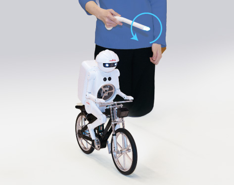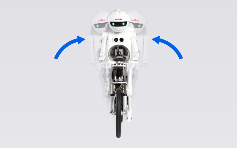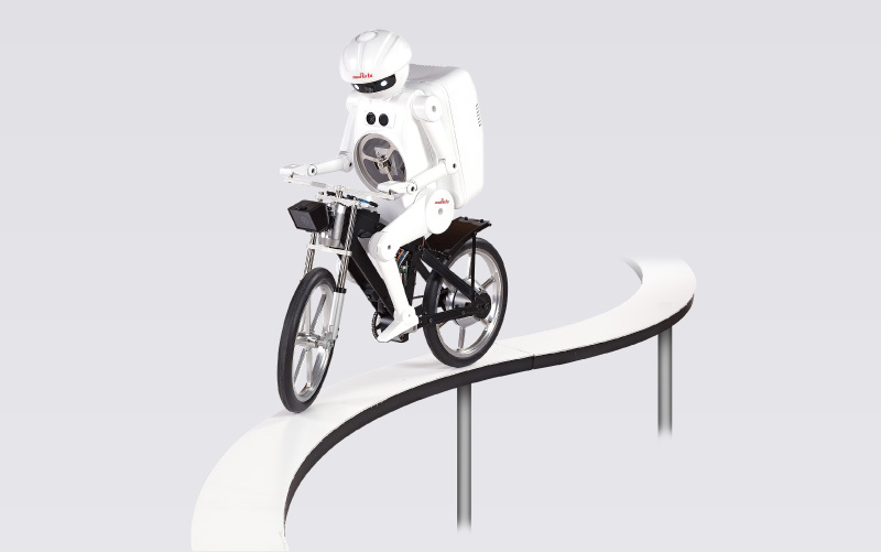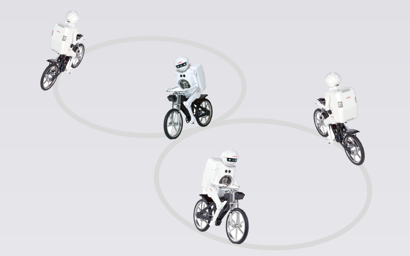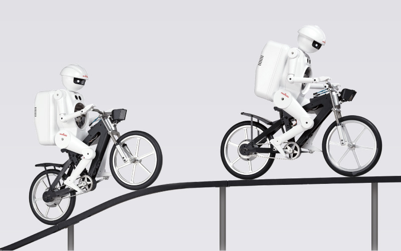 The robot is on a bicycle. It maintains its balance even when fully stopped! Performs stunts such as climbing slopes and running on balance beams.