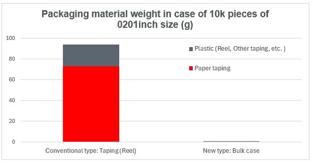 On the environmental side, the bulk case can reduce the weight of packaging material by up to approximately 99% compared to Murata’s conventional taping method in the case of packaging 10,000 0201-inch size MLCCs. This significantly reduces the use of plastic and paper, thereby helping to lower environmental compliance costs such as waste disposal taxes, incineration costs, and carbon taxes. Furthermore, it also helps to reduce greenhouse gas (GHG) emissions associated with the manufacture, transport, and disposal of packaging materials.