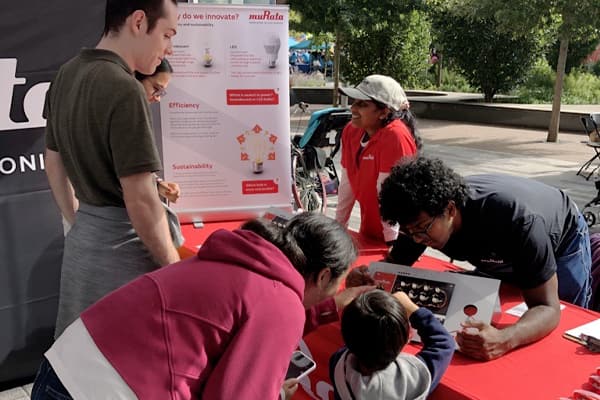 Meredith: “In the hands-on exhibit, visitors turned a hand-cranked generator to supply power to both LED and incandescent light bulbs. Participants experienced firsthand that it takes more effort to supply power to incandescent bulbs than LED bulbs and made the connection that LED bulbs are more efficient than incandescent ones. This experience can be a springboard for a conversation on how LED light bulbs are more sustainable because they are more efficient. It was also a great opportunity to discuss the importance of innovation for our society and Murata.”