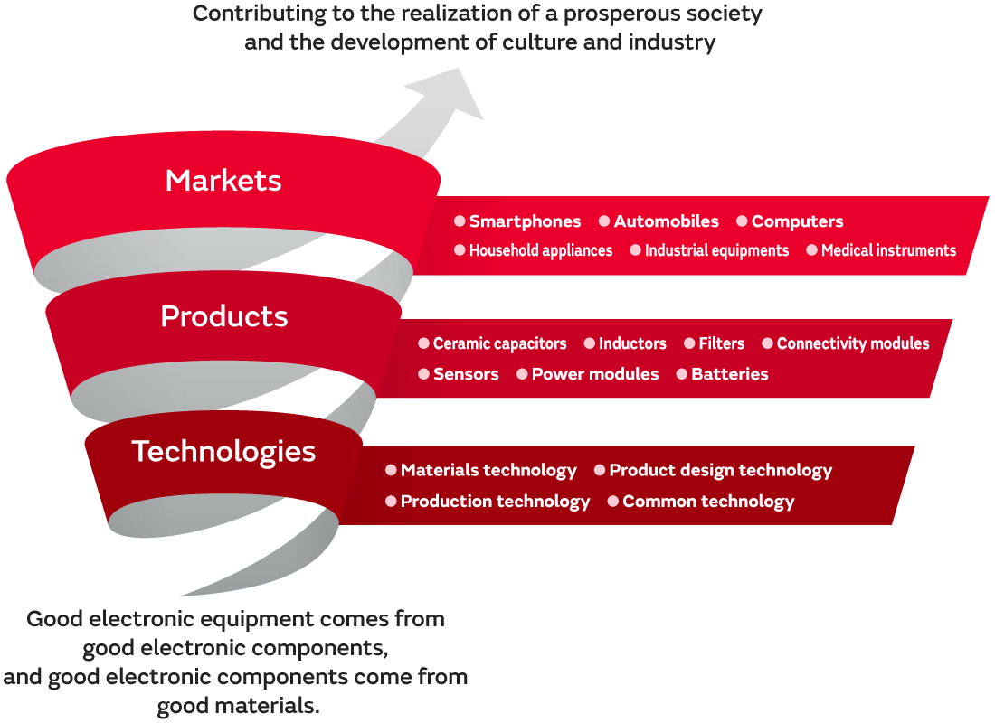 Our component products as represented by ceramic capacitors, inductors, and EMI suppression filters as well as connectivity modules, high-frequency filters, sensors, power modules, batteries, and other device and module products are utilized in a wide range of markets including smartphones, automobiles, computers, household appliances, industrial equipment, and medical instruments.