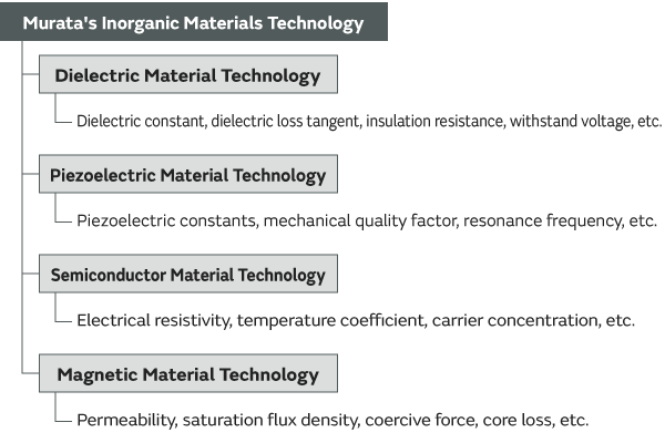 • Murata's inorganic materials technology spans a wide range, including dielectric ceramics for Multilayer Ceramic Capacitor (MLCC), piezoelectric materials, semiconductor materials, and magnetic materials.