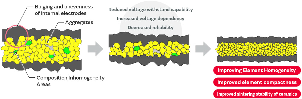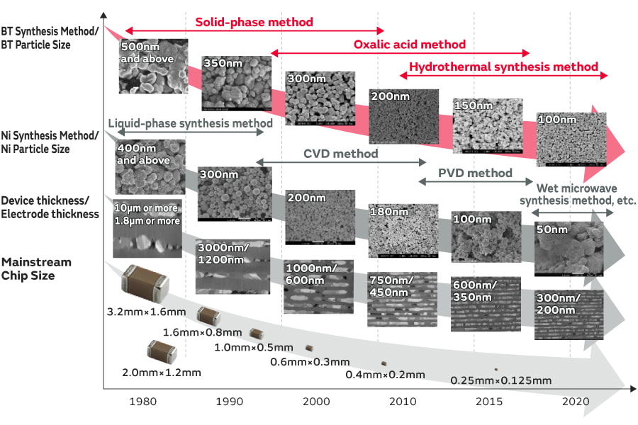 Murata's inorganic material technology has driven the miniaturization and increased capacitance of Multilayer Ceramic Capacitor. Supporting this evolution are technologies for thin-film and multilayer formation of dielectric elements and Ni internal electrodes. Achieving these requires the essential miniaturization and homogenization of the dielectric and internal electrode materials themselves.