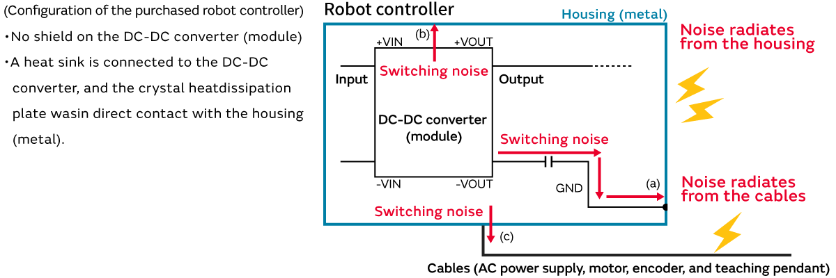 Immunity Noise Countermeasures: Points susceptible to malfunction due to noise interference are identified. As with emission noise countermeasures, noise sources, conduction paths, radiation sources, and generation mechanisms are estimated and verified through measurement and simulation.