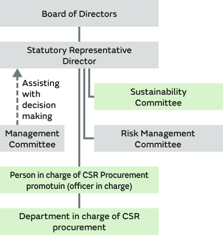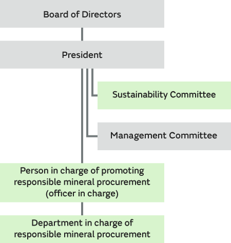 Murata has issued the "Murata Group Supply Chain CSR Procurement Guidelines" and is working to instill the CSR procurement approach that we have our suppliers observe and put into practice. In addition, information on the states of compliance and any issues with the different areas of CSR procurement within the company are shared with top management, and decisions are made regarding these matters. The different areas of CSR procurement involved include namely "human rights and labor," "health and safety," "environment," "ethics," and "management systems" under the Sustainability Committee established directly under the president and areas including "BCP" and "information security" under the Risk Management Committee. Topics discussed by each Committee are supervised by the Board of Directors.