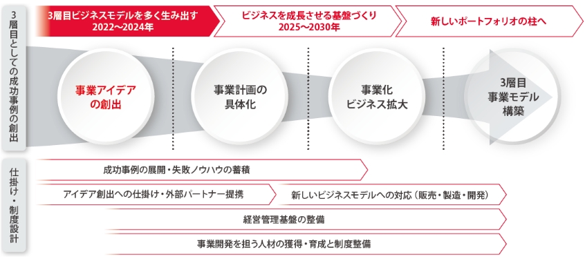 中期方針2024では、3層目事業が2030年以降にポートフォリオの柱となっていくことを目指す第1ステップとして、クイックサクセス、スモールサクセスを積み重ねながら、ムラタの強みを活かせる領域を見極めていきます。さらに3層目の新たなビジネスを創出していくために、従来の社内の枠組みでは対処できない課題への取り組みとして人材や組織のあり方も含めた戦略の具体化を実行していきます。