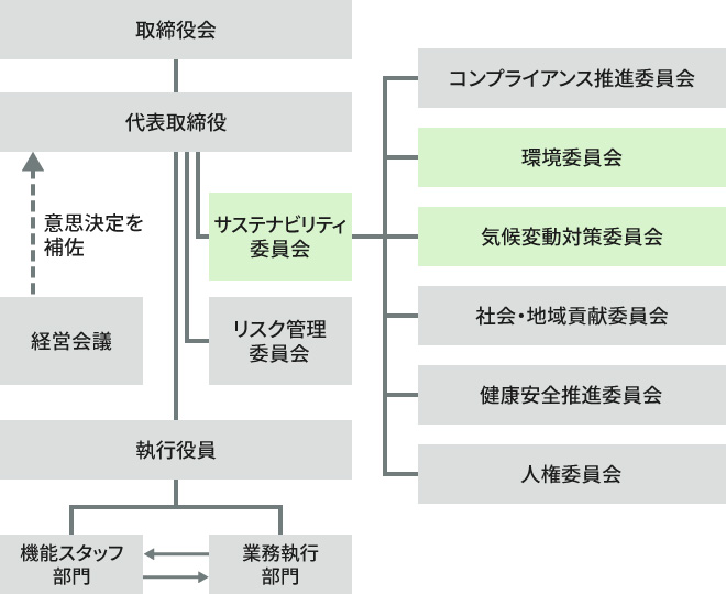 環境委員会では、顧客要求や社会動向の変化から取り組むべき環境課題(資源循環や生物多様性など)を審議・決定し、これに関わる方針や中長期的な取り組みを事業活動を通じて推進しています。気候変動対策委員会ではGHG削減や再エネ導入などの気候変動対策を推進しています。各委員会で議論された事案は、サステナビリティ委員会へ報告・審議された後、取締役会の監督を受けています。