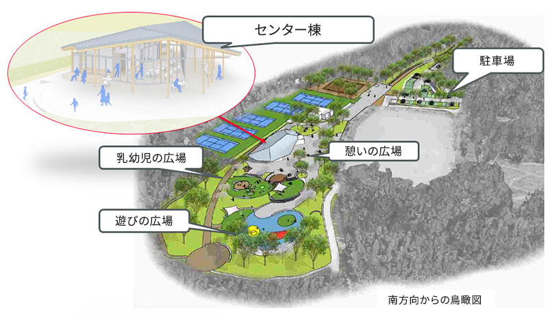 センター棟は、休憩所やトイレなどの機能を備え、公園のさまざまな活動を支える施設として整備します。