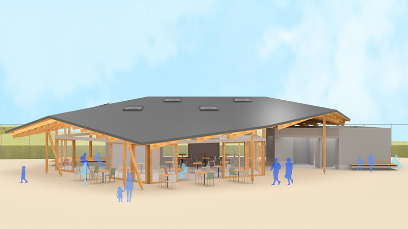 長岡公園の中心的な場所に大屋根を架け、その下に、すべての公園利用者の皆様が憩うことのできる屋内外の快適な居場所になるとともに、新しい活動拠点になります。京都府産材のスギ材で構成する木造屋根架構は、小さな木材を巧みに組み合わせて大きな空間をつくります。 また、遊びの広場と一体利用されることや、空調の必要のない中間期には室内外を連続させて広々と使うなど、環境に配慮したフレキシブルな利用形態が可能です。村田製作所製の蓄電池を設置し、太陽エネルギーを賢く利用する予定です。