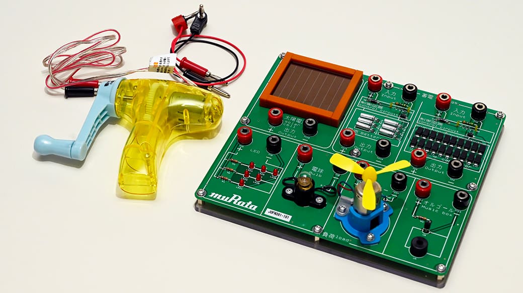 電気エネルギーと環境との相関関係を考える、2012年にスタートした授業です。小学校4~6年生の電気の授業内容に合わせ、手回し発電機でコンデンサに蓄電したり、違った負荷につなぎ、消費電力の差を学ぶ体験を提供しています。