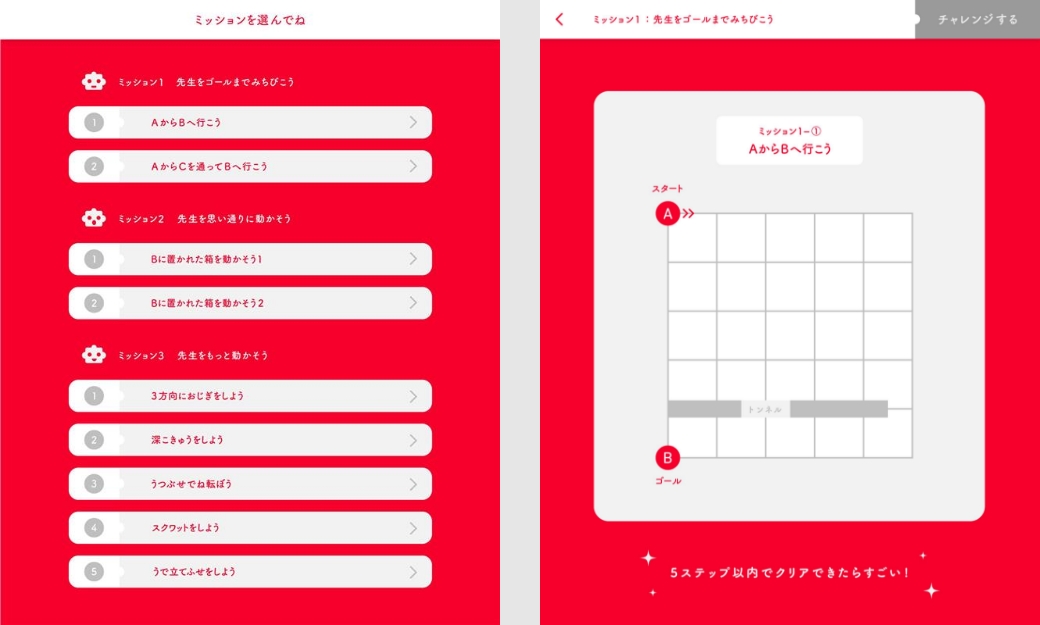 日本の小学校におけるプログラミング教育必修化に伴い、教育現場からの要望を取り入れたコンテンツ「動け!!せんせいロボット」を使用した授業です。論理的思考を養う力の習得を目的とし、親しみやすい授業になるよう、ロボット役は人間が務め、タブレット上で動きの指示を出します。