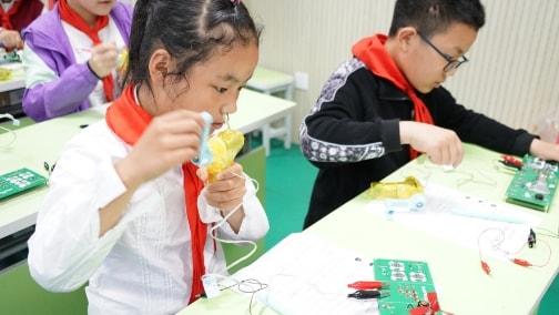 中国で実施した環境教育の出前授業では、子どもたちに手回し発電機を操作してもらい、電気エネルギー、コンデンサの特徴、エネルギー変換原理などの習得に加え、社会課題となっている地球温暖化について学ぶ機会を提供しました。