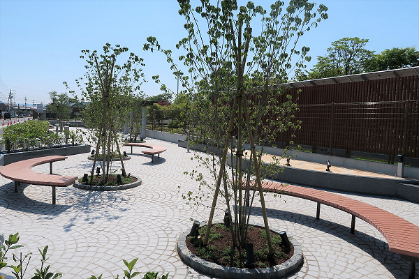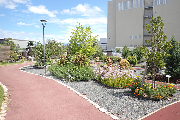 武生事業所には常時一般開放をしている広場、公園が3か所あります。2021年に西側エリアに「結縁庭(ゆいえんてい)」が完成し、2022年には正門横の「公開広場」が完成、2025年に南西側に「ムラタグリーンパーク」が完成しました。結縁庭では様々な種類の植物を育てており、和の雰囲気を楽しむことができます。公開広場は夜になるとライトアップもされとても綺麗です。ムラタグリーンパークはとても広々としており、芝生広場やドッグランもお楽しみいただけます。ベンチに座ってほっと一息つくことができますので、ぜひ地域のみなさまもご利用ください。