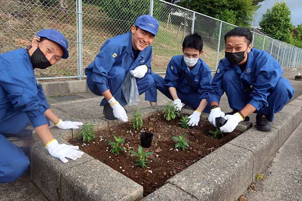 会社周辺の美化を目的として「夏から秋」、「冬から春」のシーズンごとに周辺道路の街路樹花壇に花の植栽しています。この取り組みは、近隣町会の方々からご好評をいただいています。