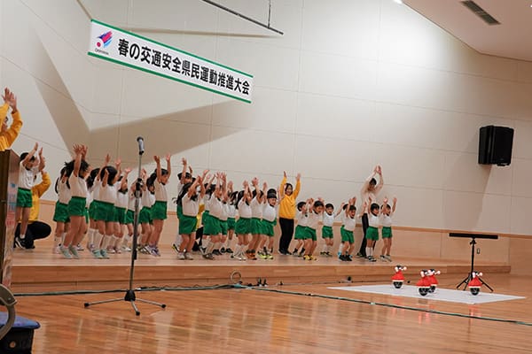 2025年4月4日、津山市のリージョンセンターにて開催された「令和7年春の交通安全県民運動推進大会」に、当社の「村田製作所チアリーディング部」が出演しました。交通ソング「いのちのルール♪」に合わせて、津山市内の園児と一緒にパフォーマンスを行いました。