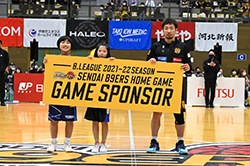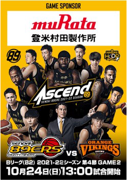登米村田製作所では、地域への貢献とスポーツ振興のため、2021年10月24日(日)に登米蔵ジアムで開催されたプロバスケットボールリーグの仙台89ERS対愛媛オンレジバイキングスの1日ゲームスポンサーとして協賛しました。