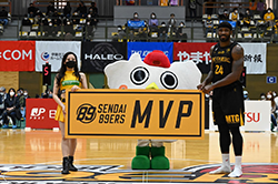 逆転の3ポイントシュートを決めたジャスティン・バーレル選手がMVP賞を受賞することとなり、弊社より、登米市の特産である(株)伊豆沼農産の「伊達の純粋赤豚しゃぶしゃぶ、焼き肉セット、伊豆沼ハム特選詰め合わせ」を贈呈しました。ジャスティン選手が世界一好きな食べ物がしゃぶしゃぶとのことで、とても喜んでいただけました!