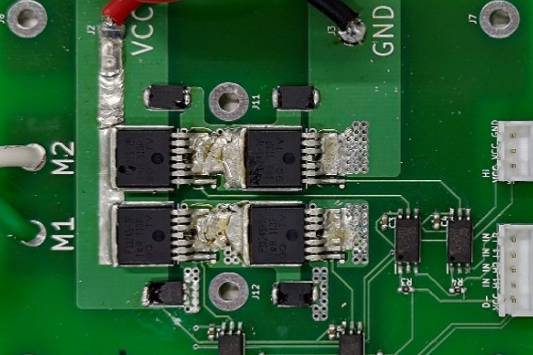 大電流モーターを動かすため、パターンはハンダ盛り盛り。ロボコン系にはお馴染みの光景。