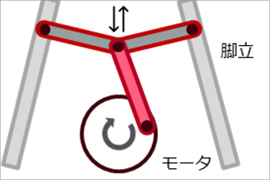 モーターの回転動作をスライダークランクリンクで直動の上下反復動作に変換し左右の脚立と連結することで開閉の動作を実現。