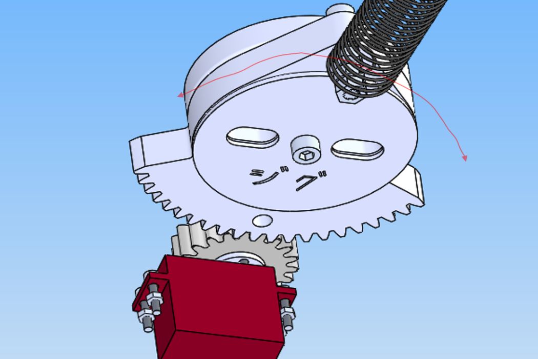 サーボモータのトルク増加とバネの左右方向の移動距離を確保するため、減速機を導入。さらに、トルクを左右のみに伝達させるため上下押さえを設置、随所に技巧を凝らしている。