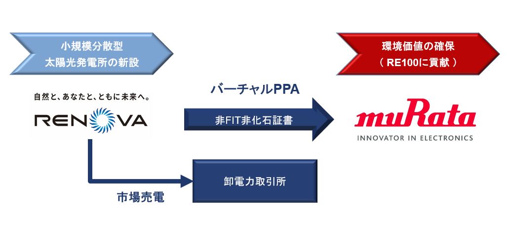 株式会社村田製作所(以下、「当社」)は、株式会社レノバ(本社:東京都中央区、代表取締役社長:木南 陽介、以下「レノバ」)とバーチャルPPAによる環境価値売買契約を締結しました。