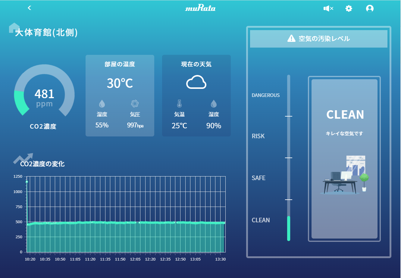 村田製作所が開発したAIRSualを用いて、若葉カップの大会会場である西山公園体育館内のCO2濃度をモニタリングします。AIRSualは、環境に応じた設定が不要なため、簡単に正しいCO2濃度を測定することが可能です。また、CO2濃度の増減の傾向をAIなどの最先端アルゴリズムにより分析できるため、定量的な根拠に基づく換気ができます。また、昨今の猛暑に対応するため、暑さ指数(WBGT)を検知および管理者へのアラート機能を追加する予定です。