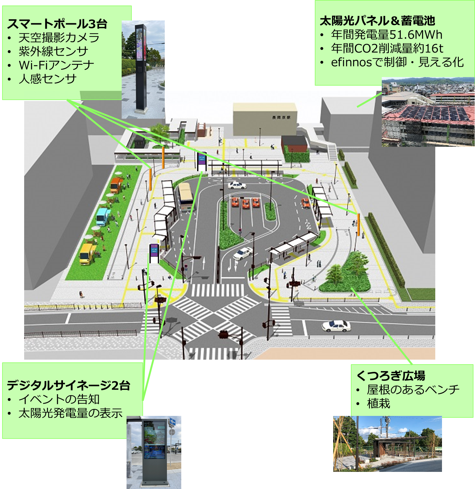 JR長岡京駅東口駅前広場の「ゼロカーボン化」に向け、再生可能エネルギーを導入し、スマート化を図ります。また、広場に設置したスマートポールから取得した情報で市民の生活環境を豊かにし、にぎわい・交流のある駅前広場を目指します。