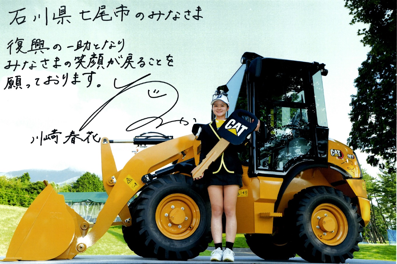 その中で今回、所属先である村田製作所様と相談をさせて頂き、8月に開催されたJLPGA国内女子ゴルフツアー「CAT Ladies 2024」の優勝副賞としていただいた「CATミニホイールローダ901」を石川県七尾市へ寄贈することにいたしました。微力ではありますが、被災地の復旧作業の力になればと考えております。