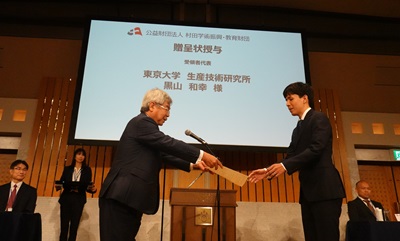 7/18 贈呈式の様子:(左から)村田学術振興・教育財団 理事長 村田 恒夫、東京大学 生産技術研究所 黒山 和幸氏