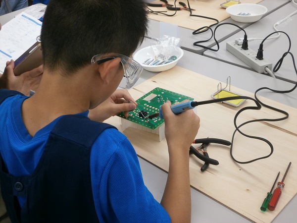 子どもたちは身の回りの電子機器の中で活躍している電子部品の種類やはたらきを学び、自身の手ではんだ付けを行い、回路を組み立てます。