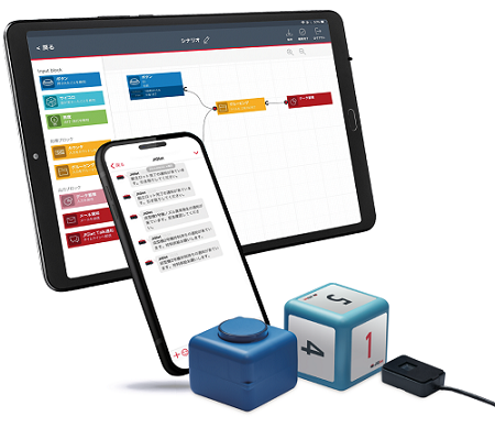 「JIGlet」には、各面の意味付けを自由に設定してその時間や回数を記録する「サイコロデバイス」、数をカウントしたり離れた人を呼び出したりする「ボタンデバイス」、作業ランプの点灯・消灯を検知する「照度デバイス」、の3種類があります。これらと指一本で操作可能な、データ収集・可視化用画面、通知用チャットアプリを組み合わせて使うことで、ITの知識がない製造現場の担当者でも、簡単に設備や人の状態を記録・蓄積して、工程のばらつきやムダをグラフで見える化することができます。ニーズに合わせてデバイスの数や種類、意味づけを変えることができるため、さまざまな改善活動や課題解決に活用可能です。またデバイスは既存設備に後付けができるため、大規模な設備導入・投資が不要で簡単に導入できます。
