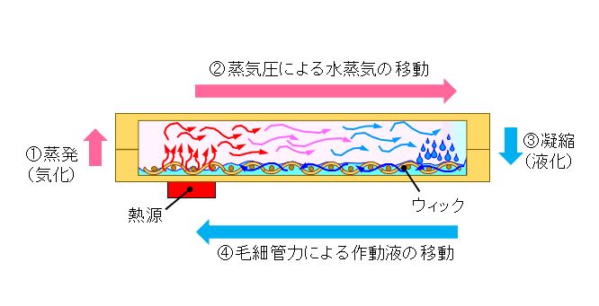 ベイパーチャンバーは、薄い金属箔を貼り合わせた筐体(コンテナ)の中に、作動液(水)とウィックを封入した熱拡散デバイスです。熱源で生じた熱を受けて作動液が蒸発し、蒸気がベイパーチャンバー内部で拡散することで放熱を行います。放熱が行われると、蒸気は液体として再度凝縮し、微細な隙間を備えたウィックにより、再び熱源まで循環する構造となっています。