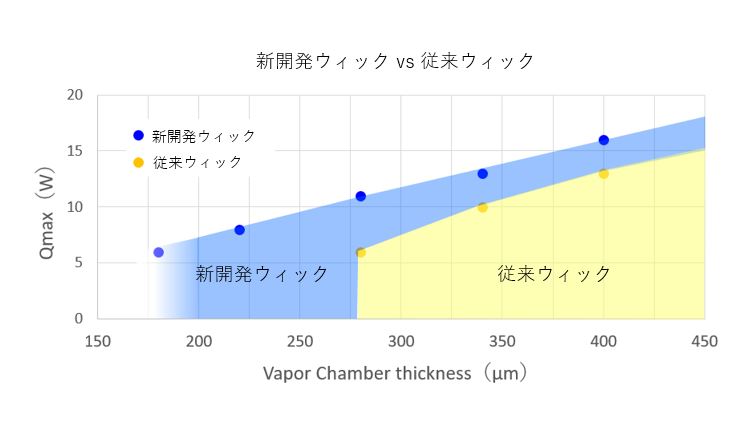 下図は新しいウィックと従来ウィック(金属メッシュ)をベイパーチャンバーに組み込んだ時の性能を表したものです。新しいウィックは、従来ウィックに比べて数倍の毛細管力を有するため、ベイパーチャンバーのさらなる高性能化、薄型化が可能になります。