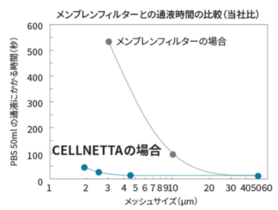 事例1)目開き5µmのメンブレンフィルタとCELLNETTAでPBS(生理食塩水)50mlを通液した場合の所要時間(当社比)