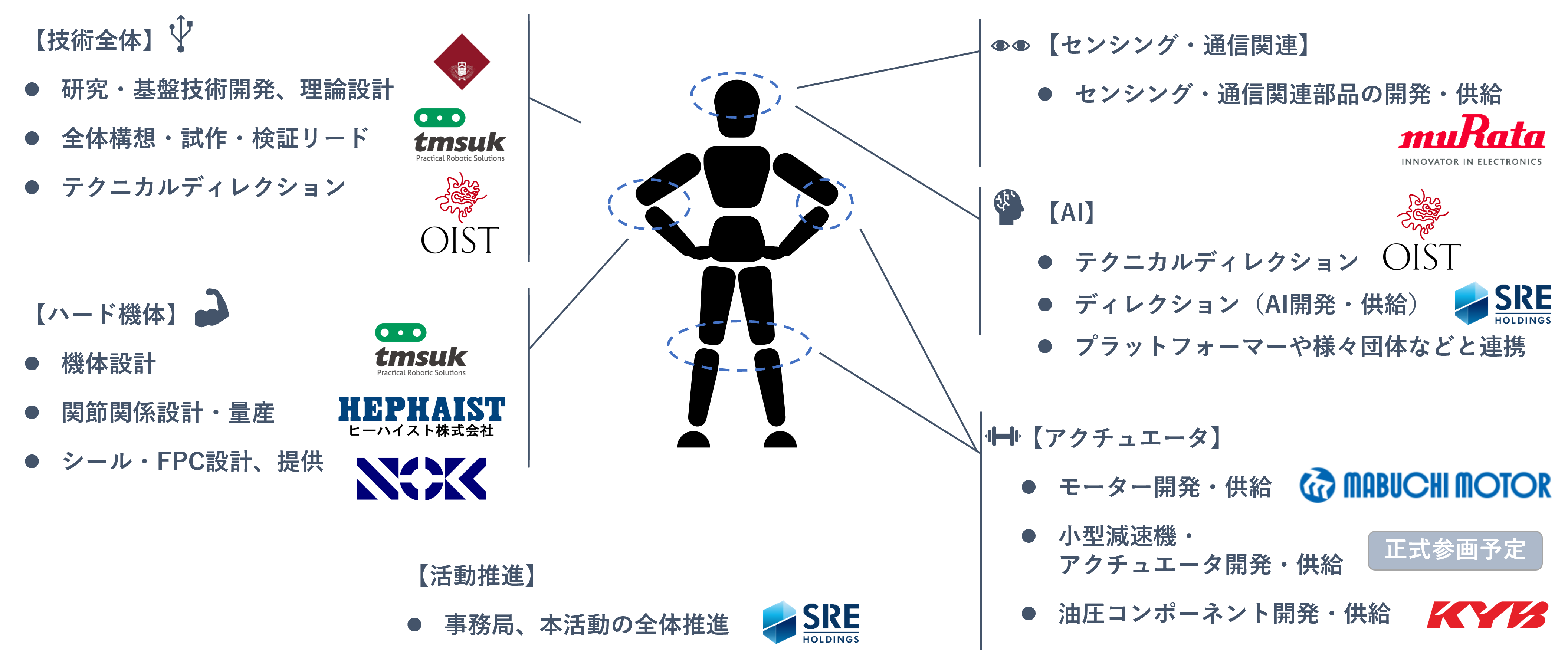 現在、以下の企業・機関がメンバーとして参画しており、加えて、多数の企業・団体との連携に向けた対話が進行中です。産業界・学術界を横断する“ヒューマノイドのための日本連合”として、今後も広く参画を募ってまいります。