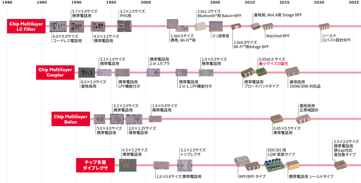 通信技術の高度化に伴い、実装スペースの制約と多バンド対応が求められる中、CC Co-fire技術やセラミックシートの薄膜化によって、高性能を維持しながら小型化・低背化を推進しています。誕生当時5.7mm × 5.0mmあったサイズは1.0mm × 0.5mmになり、高さも2.25mmから0.3mmへと進化しています。