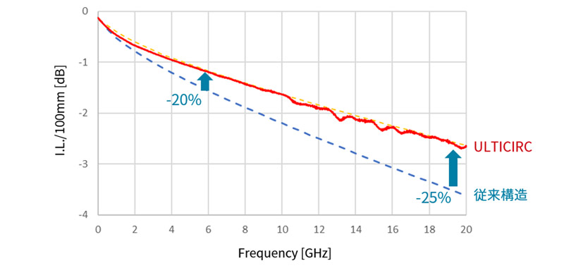 超低誘電率LCPフレキシブル基板の従来構造との特性比較