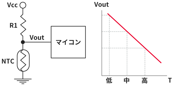 温度検知・温度補償用 NTCサーミスタ使用回路と出力特性