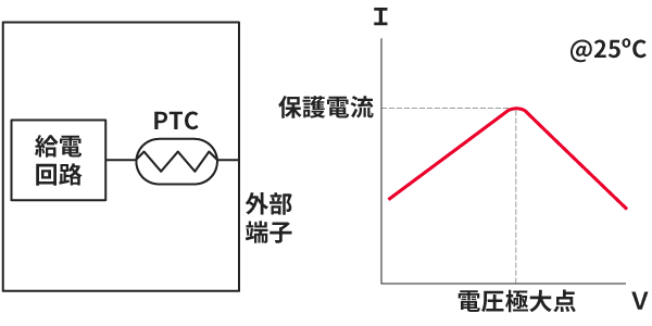 過電流保護用 PTCサーミスタ使用回路と出力特性