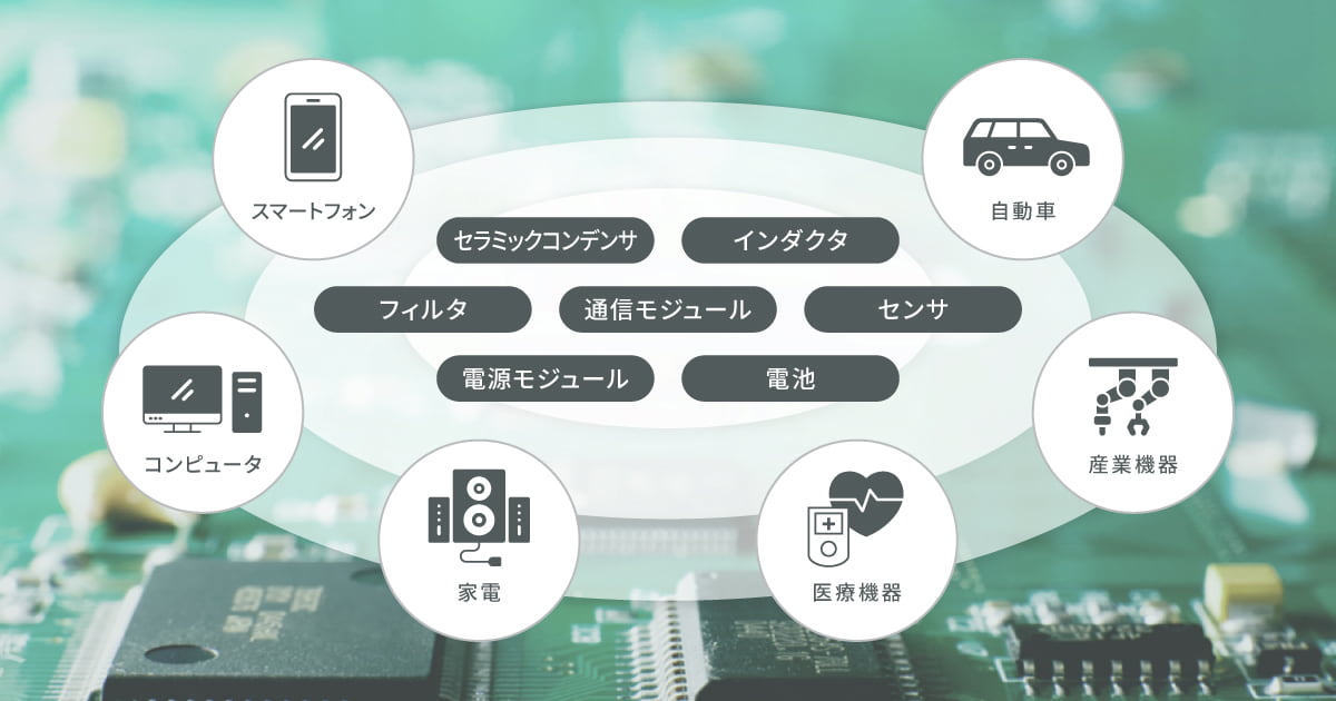 代表的なセラミックコンデンサをはじめ、インダクタ・EMI除去フィルタなどのコンポーネント製品や、通信モジュール・高周波フィルタ・センサ・電源モジュール・電池などのデバイス・モジュール製品は、スマートフォン・自動車・コンピュータ・家電・産業機器・医療機器等、幅広い市場で活用されています。