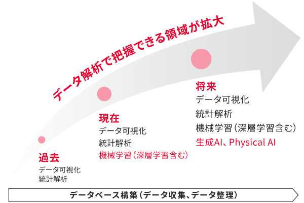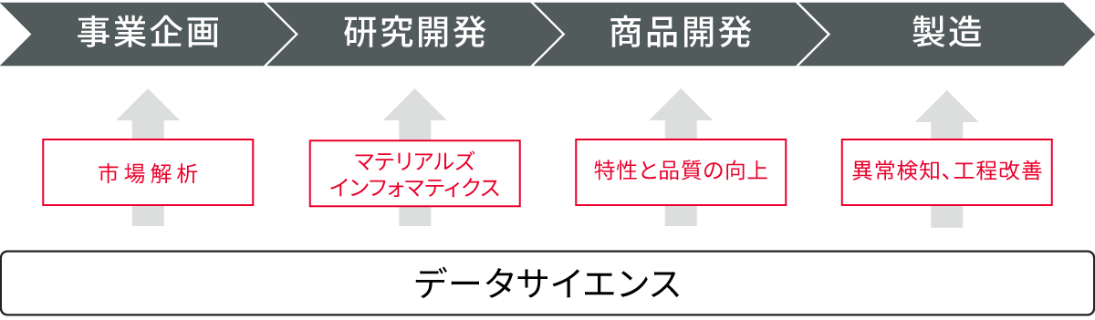 製造現場では、製造過程で得られる大量のデータを収集・解析し、異常検知や不良発生の要因分析を行うことで、工程の改善や製品の品質向上に役立てています。さらに商品設計の段階では、製品の特性や品質・信頼性向上のために各種要因を解析し、設計の最適化を図っています。また、新規事業開発においては、人間の手では把握しきれない膨大な文書データから市場動向を解析し、事業戦略の立案や顧客ニーズの把握に活用しています。