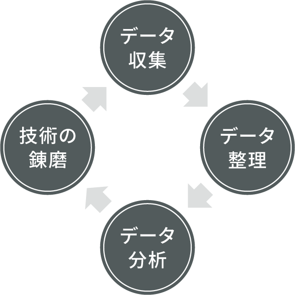 ムラタのデータサイエンス技術は、電子部品の開発・製造・サービス提供において、社是で掲げる「科学的管理を実践する」ために必要な情報や知見をデータの中から抽出する技術を指します。これは、どのようなデータを収集するのか、収集したデータをどのように整理するのかという段階から始まり、その整理されたデータを解析する統計解析技術や機械学習技術によって構成されています。
