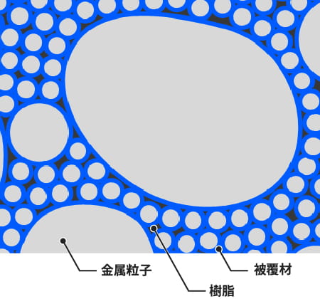代表例が、パワーエレクトロニクス回路で使われるメタルアロイパワーインダクタです。金属磁性粉と絶縁性樹脂を組み合わせた複合材料に、熱と圧力を加えて充填率を高め、性能を向上させています。磁性コアの高性能化のためには、高信頼性の樹脂を金属粒子に均一に被覆させることが重要です。被膜が薄すぎても厚すぎても製品特性は劣化します。樹脂材料の選定や界面の制御方法、混錬方法の向上に取り組んでいます。