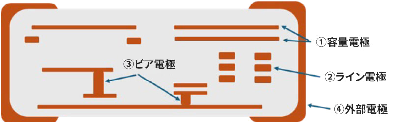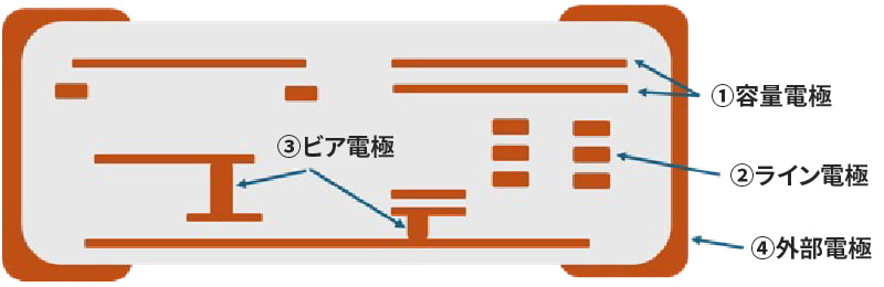その一例がLCフィルタです。1つの製品の中に、①コンデンサを形成する容量電極、②インダクタを形成するライン電極、③層間を接続するためのビア電極、④製品を基板と接続する外部電極、という4種類の銅電極を組み込み、機能に応じて設計指針を変えています。例えば容量電極には薄く平滑でガラスセラミックスとの密着性が高い設計を用い、ライン電極には細く厚く大電流に耐えられる設計を採用します。