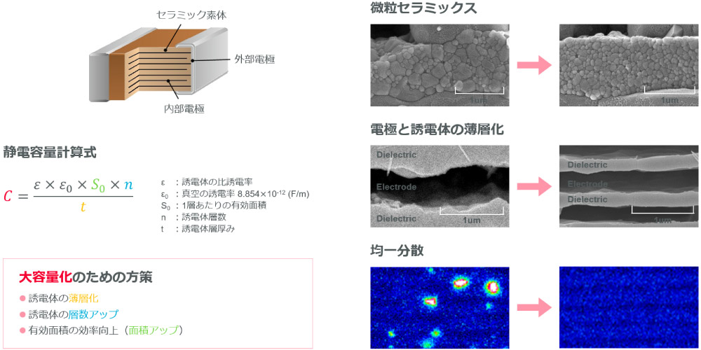 1980年代以降、携帯電話やPCの普及に伴い、小型化と高容量化の要求が高まりました。高誘電率材料のセラミック粒子の粒径制御は薄層積層化プロセスなど、独自の材料技術やモノづくり技術に磨きをかけて、高静電容量を実現しつつ、小型化を可能にしたコンデンサの開発に成功しました。これら要素技術の革新により、高静電容量・小型化の分野で、技術的先駆者として業界を牽引しています。