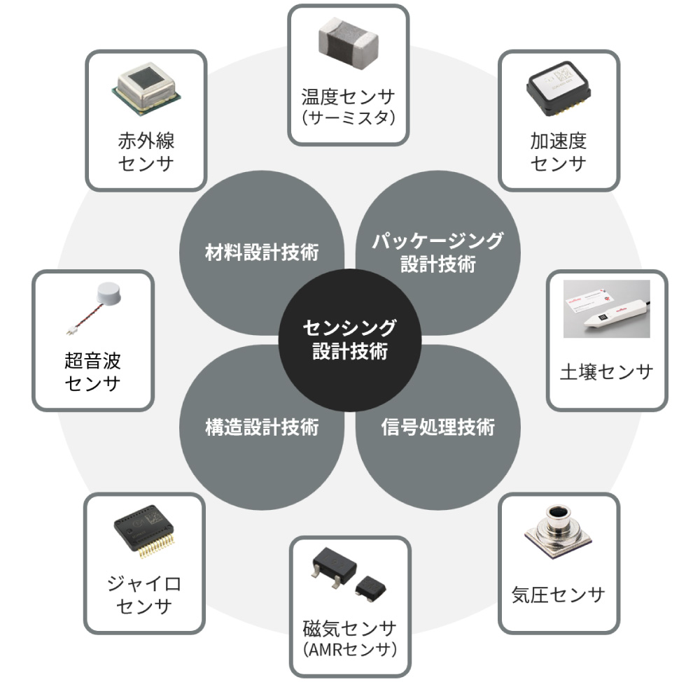 ムラタのセンシング設計技術の強みは、材料設計・構造設計・電子回路設計・ソフトウェア設計までを自社内で一貫して最適化できる総合力にあります。