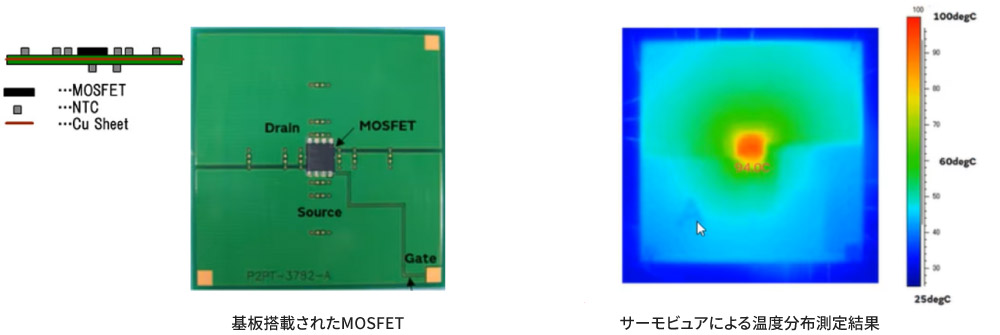 さらに車載・産業・医療など幅広い分野の機器における温度検知精度を高めるため、豊富な実験データと独自のシミュレーション技術に基づいた最適実装位置ソリューションを提供しています。MOSFETや電子基板を用いた詳細な温度分布測定と、CAEソフト「Femtet」による熱解析検証から導き出しています。