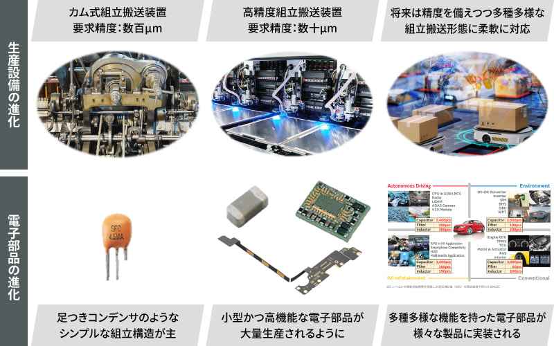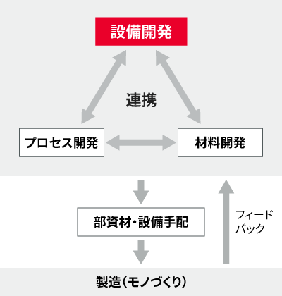 ムラタの設備要素技術の強みは、企画・設計から製造プロセス、設備開発までの一貫した連携体制をとり、重要工程の設備を自社で開発することで、独自のモノづくりを「カタチ」にできることです。